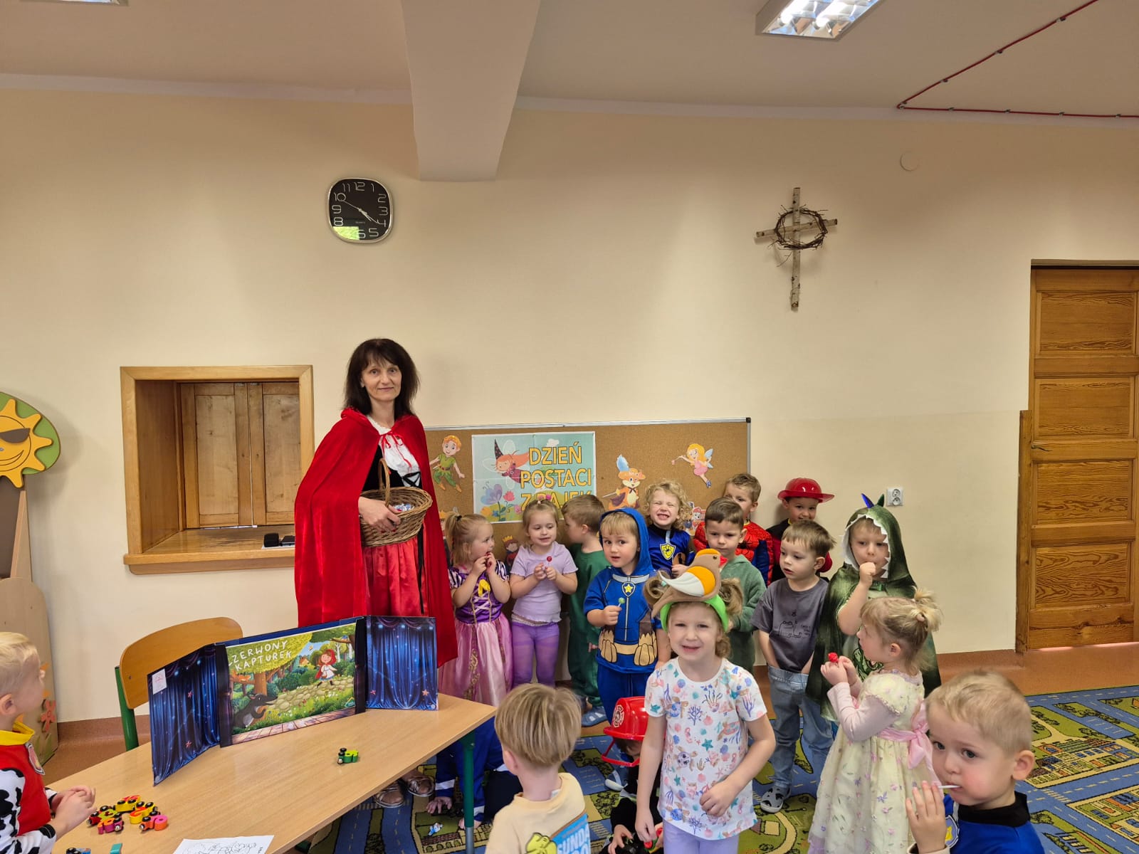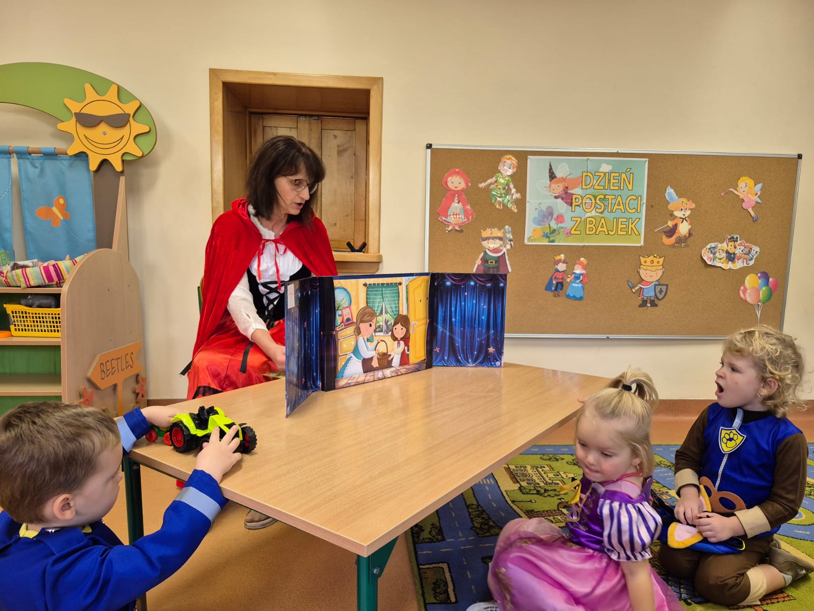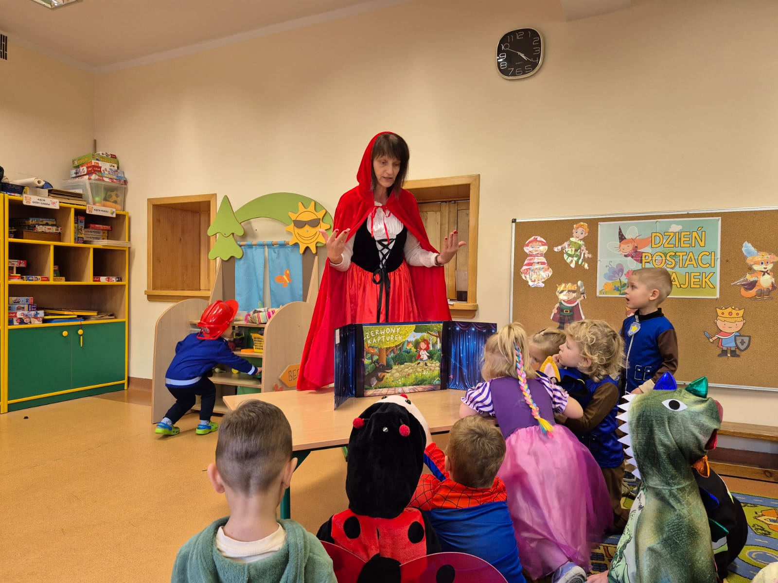 z charakterystycznym czerwonym płaszczykiem i koszykiem pełnym smakołyków rozbudziła wyobraźnię najmłodszych czytelników, zabierając ich w podróż do świata bajek. Tym razem pani bibliotekarka przybyła z „Małym Teatrzykiem” i jako narrator przeczytała jedną z najpopularniejszych bajek pt. „Czerwony Kapturek”. Dzieci słuchały z zapartym tchem, przeżywając każdą chwilę tej opowieści. Dzięki barwnym ilustracjom przedszkolaki mogły przenieść się w magiczny świat lasu, pełnego tajemniczych postaci. Dzień Postaci z Bajek okazał się pełnym magii wydarzeniem, które nie tylko bawiło, ale także edukowało dzieci, rozwijając ich wyobraźnię i wrażliwość na literaturę. Na zakończenie akcji wszystkie dzieci otrzymały od Czerwonego Kapturka słodki upominek. Spotkanie było świetną okazją do promowania czytelnictwa i wspólnego spędzania czasu w świecie bajek.