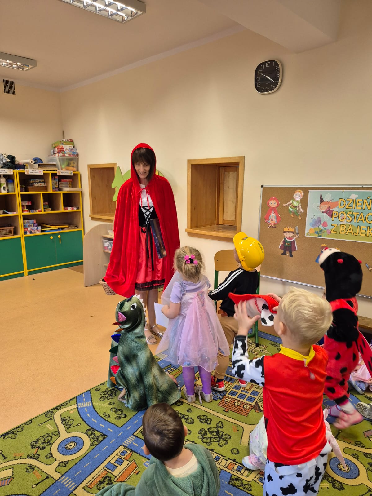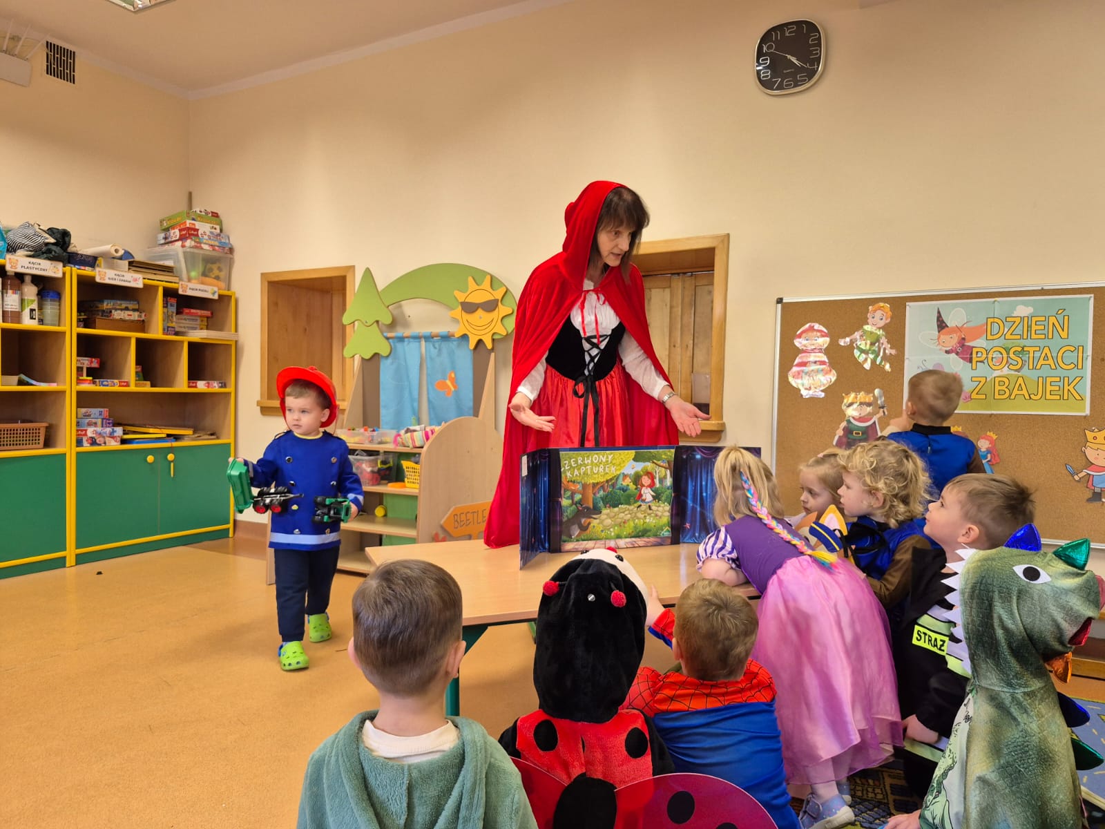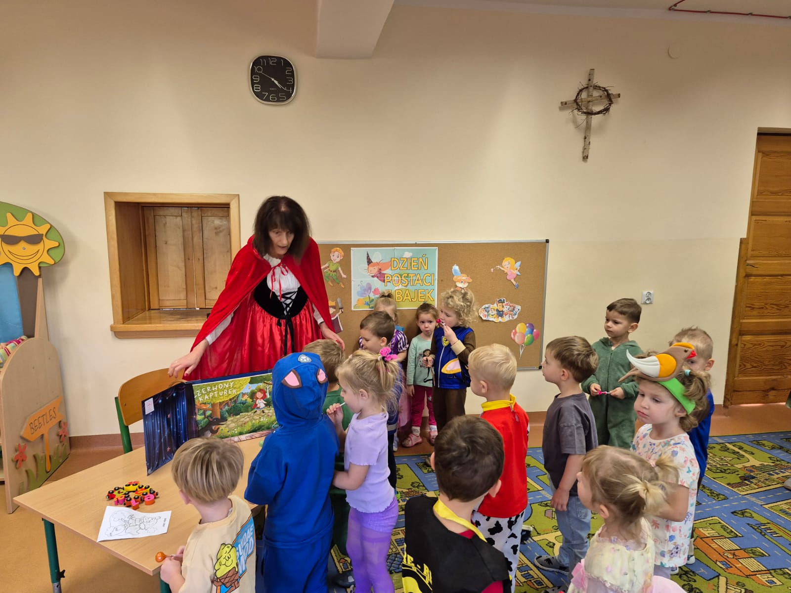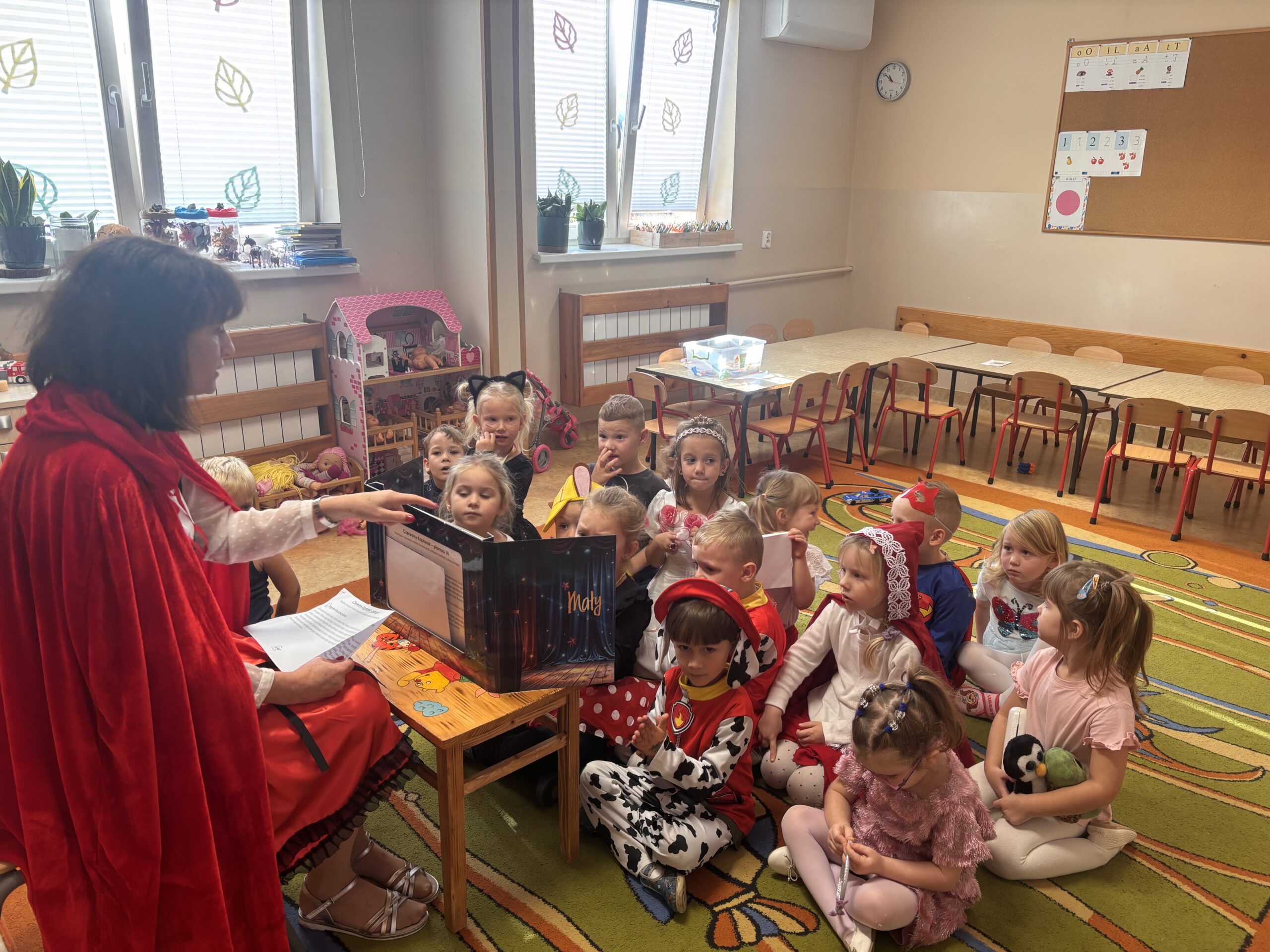 z charakterystycznym czerwonym płaszczykiem i koszykiem pełnym smakołyków rozbudziła wyobraźnię najmłodszych czytelników, zabierając ich w podróż do świata bajek. Tym razem pani bibliotekarka przybyła z „Małym Teatrzykiem” i jako narrator przeczytała jedną z najpopularniejszych bajek pt. „Czerwony Kapturek”. Dzieci słuchały z zapartym tchem, przeżywając każdą chwilę tej opowieści. Dzięki barwnym ilustracjom przedszkolaki mogły przenieść się w magiczny świat lasu, pełnego tajemniczych postaci. Dzień Postaci z Bajek okazał się pełnym magii wydarzeniem, które nie tylko bawiło, ale także edukowało dzieci, rozwijając ich wyobraźnię i wrażliwość na literaturę. Na zakończenie akcji wszystkie dzieci otrzymały od Czerwonego Kapturka słodki upominek. Spotkanie było świetną okazją do promowania czytelnictwa i wspólnego spędzania czasu w świecie bajek.