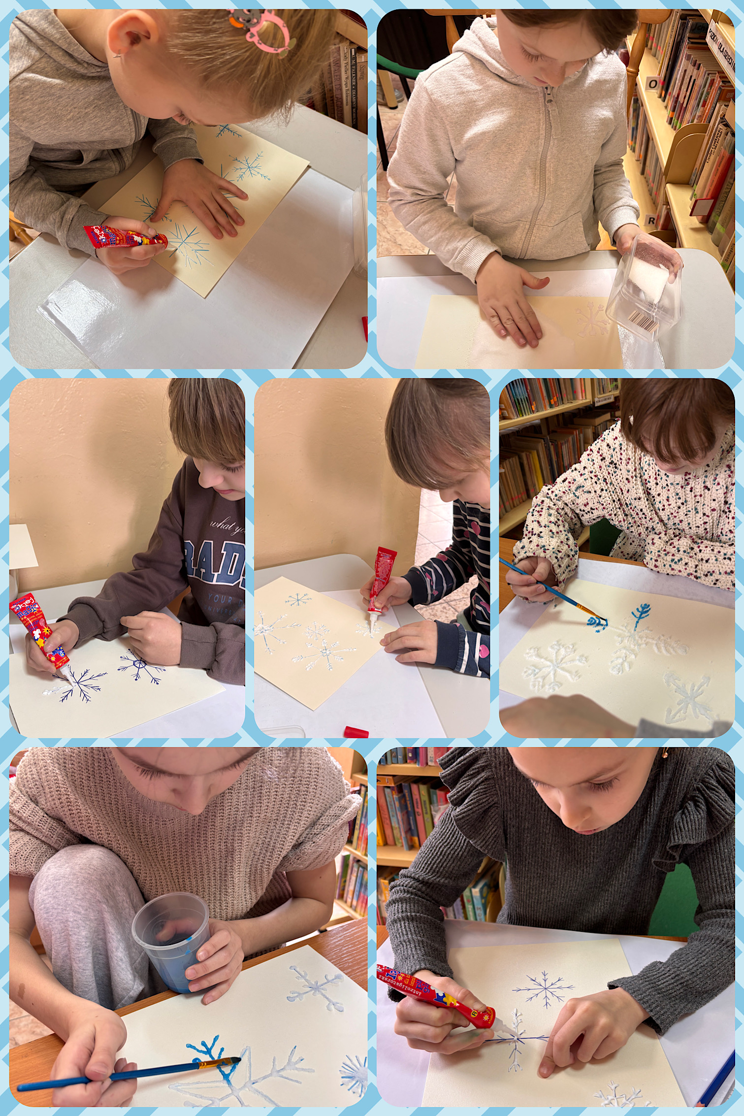 Dzieci wysłuchały fragmentów opowieści z Krainy Lodu. W czasie warsztatów plastycznych „Magiczne płatki śniegu Elsy” , przy pomocy soli i niebieskiej farby powstały piękne, zimowe dekoracje. Zajęcia zakończyły się wspólnymi zabawami ruchowymi oraz torem przeszkód.