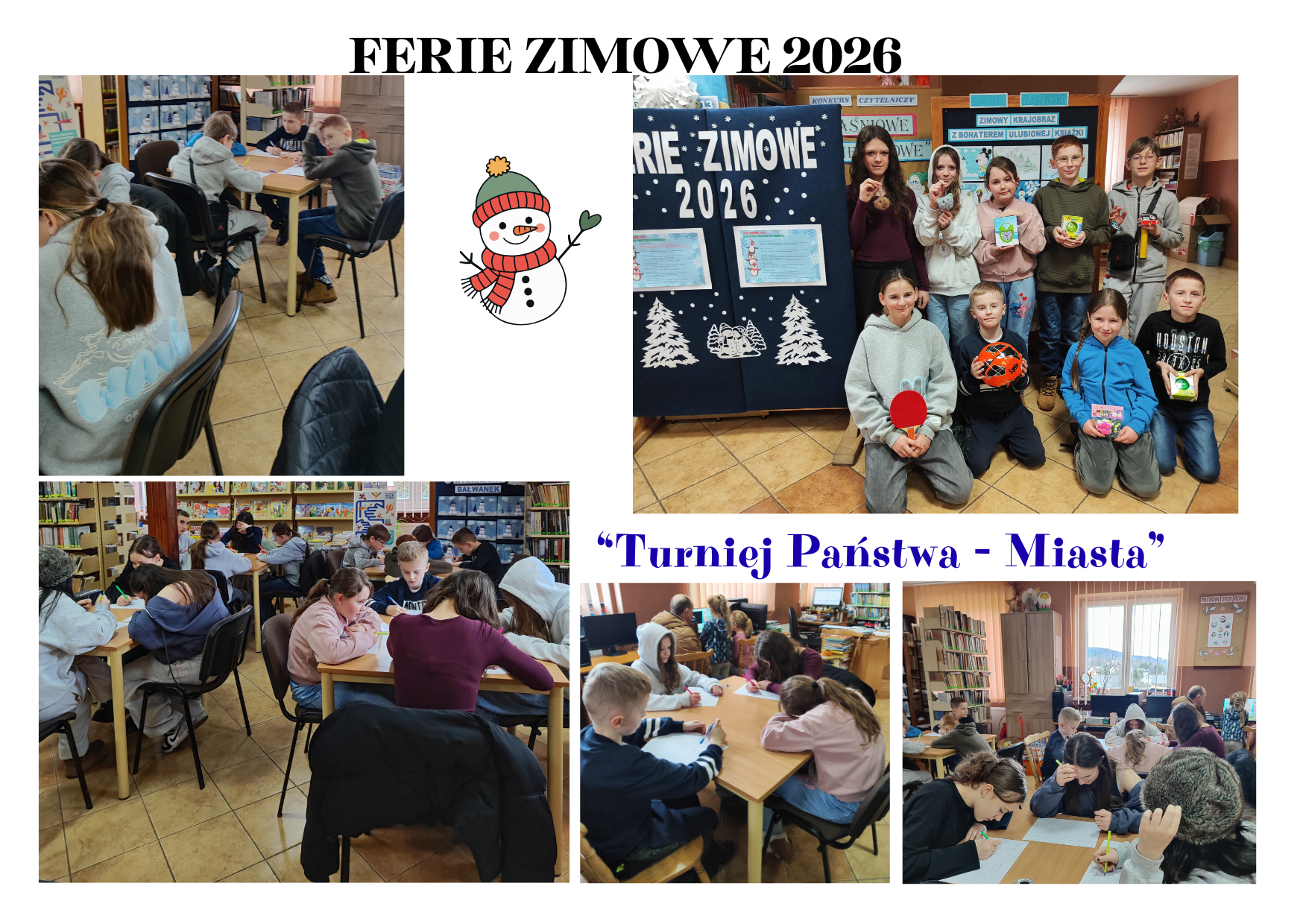 13.02.2026 r. –  „Turniej Państwa – Miasta”. Konkurs adresowany był do wszystkich uczniów Szkoły Podstawowej i Średniej i  był rozgrywany w formule „open” czyli bez podziału na roczniki. Każdy z graczy miał do uzupełnienia tabelkę z 7 kolumnami (kategoriami) zatytułowanymi: państwo, miasto, rzeka, zwierzę, roślina, rzecz, imię. W turnieju wzięło udział 14 uczestników, którzy wykazali się ogromną wiedzą. Zwycięzcami tegorocznego turnieju są:
