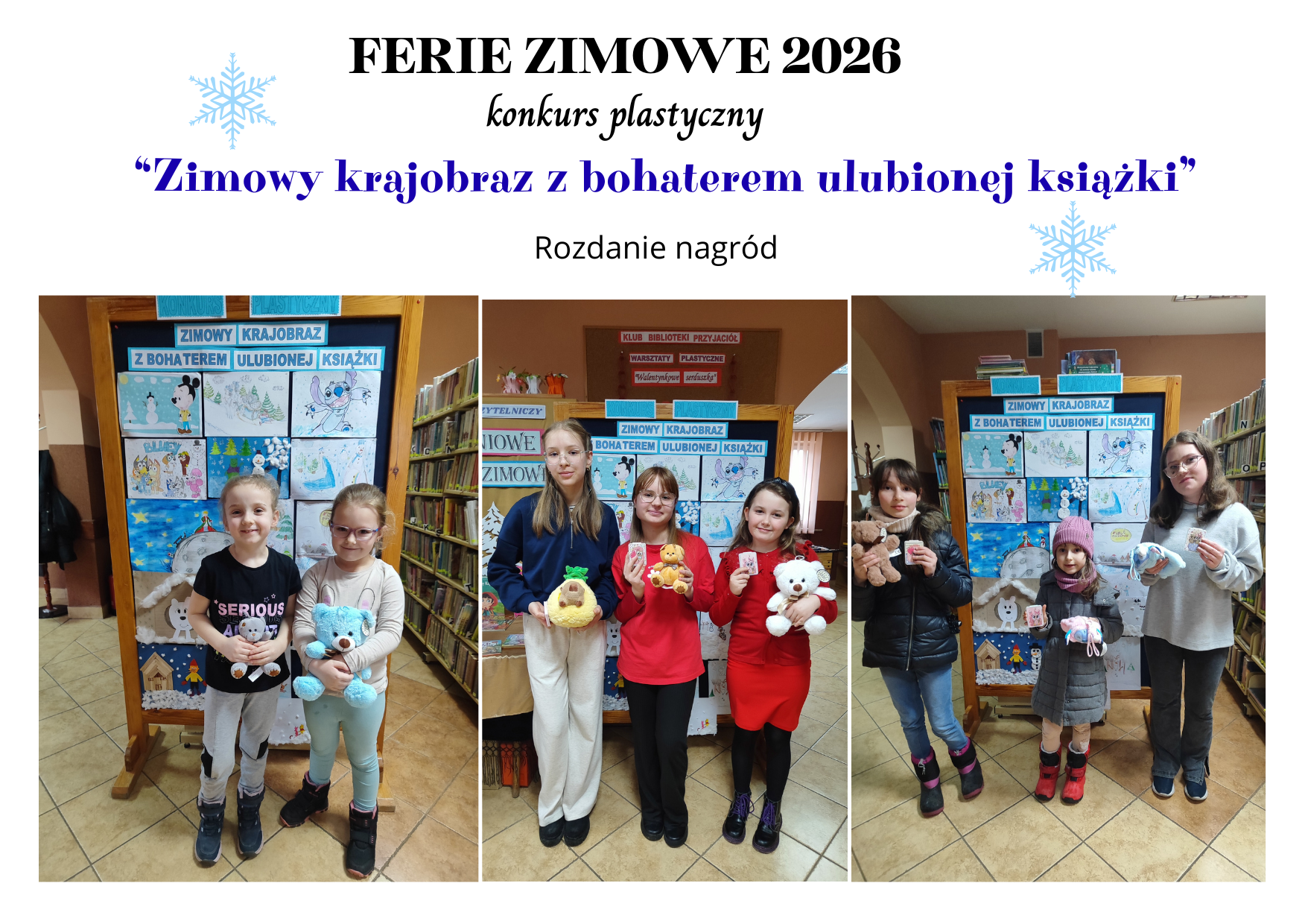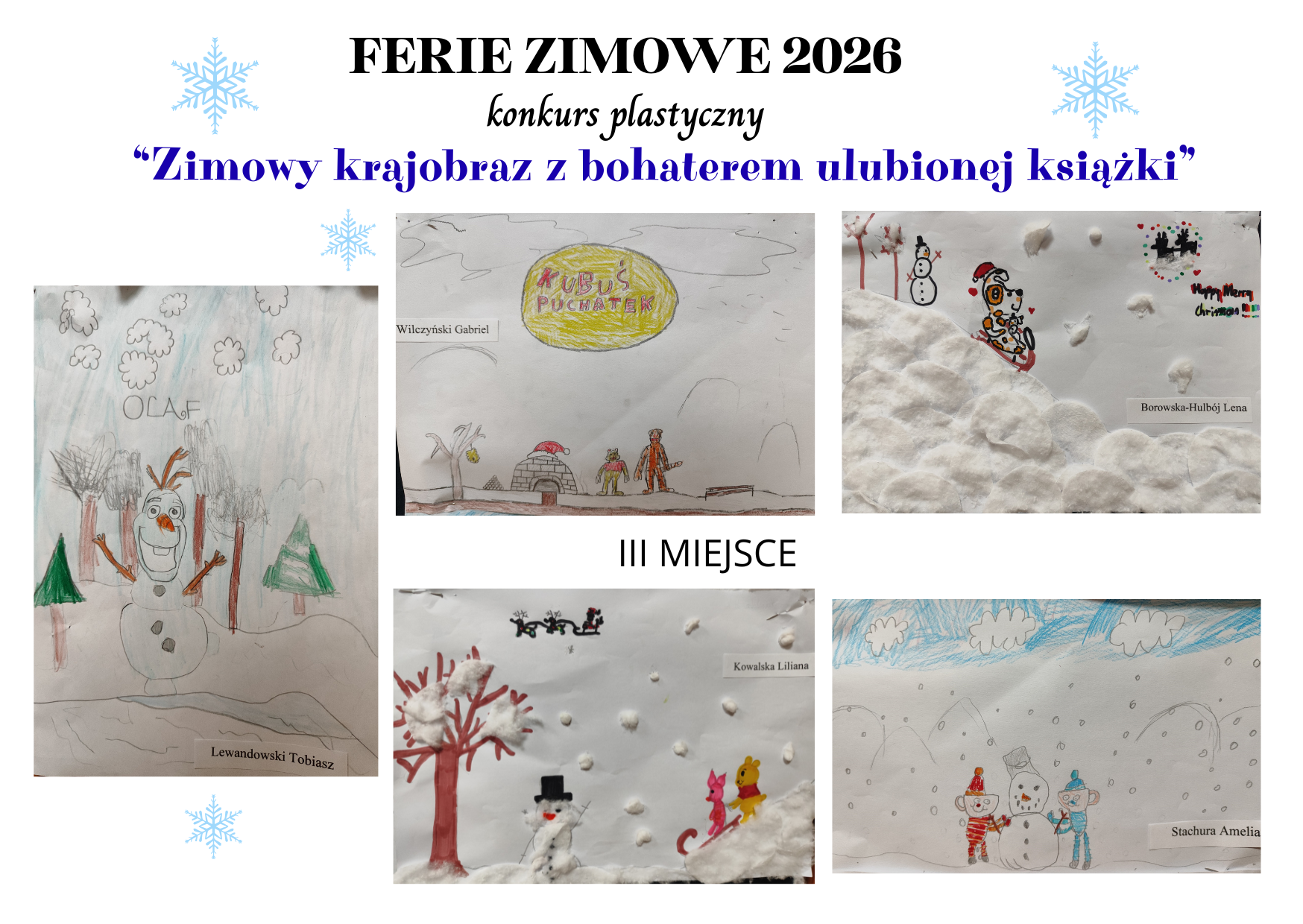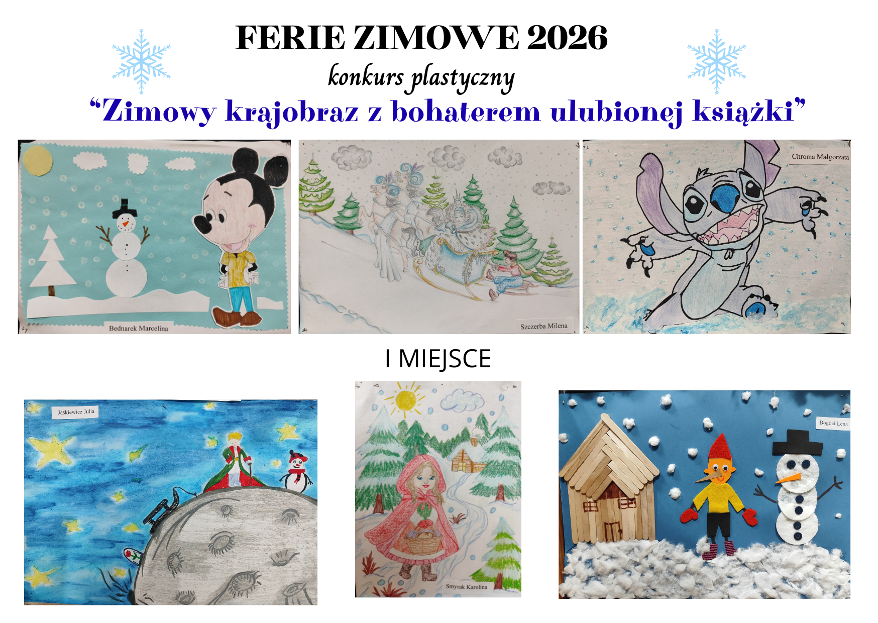 Konkurs plastyczny pn. „Zimowy krajobraz z bohaterem ulubionej książki”. Zadaniem konkursowym było wykonanie pracy plastycznej, przedstawiającej bohatera z książki z zimą w tle. Do konkursu wpłynęło 17 prac. Oto wyniki: