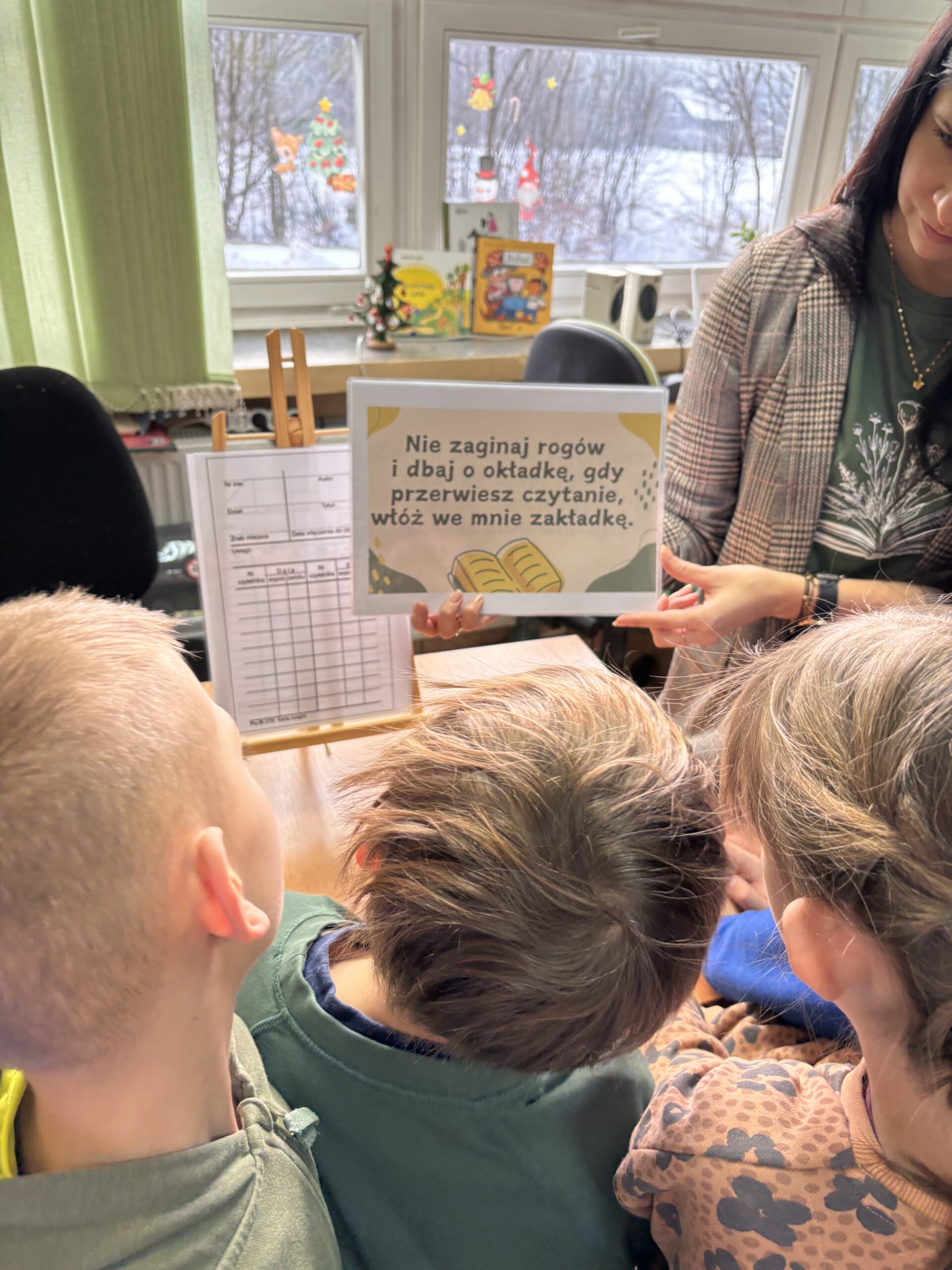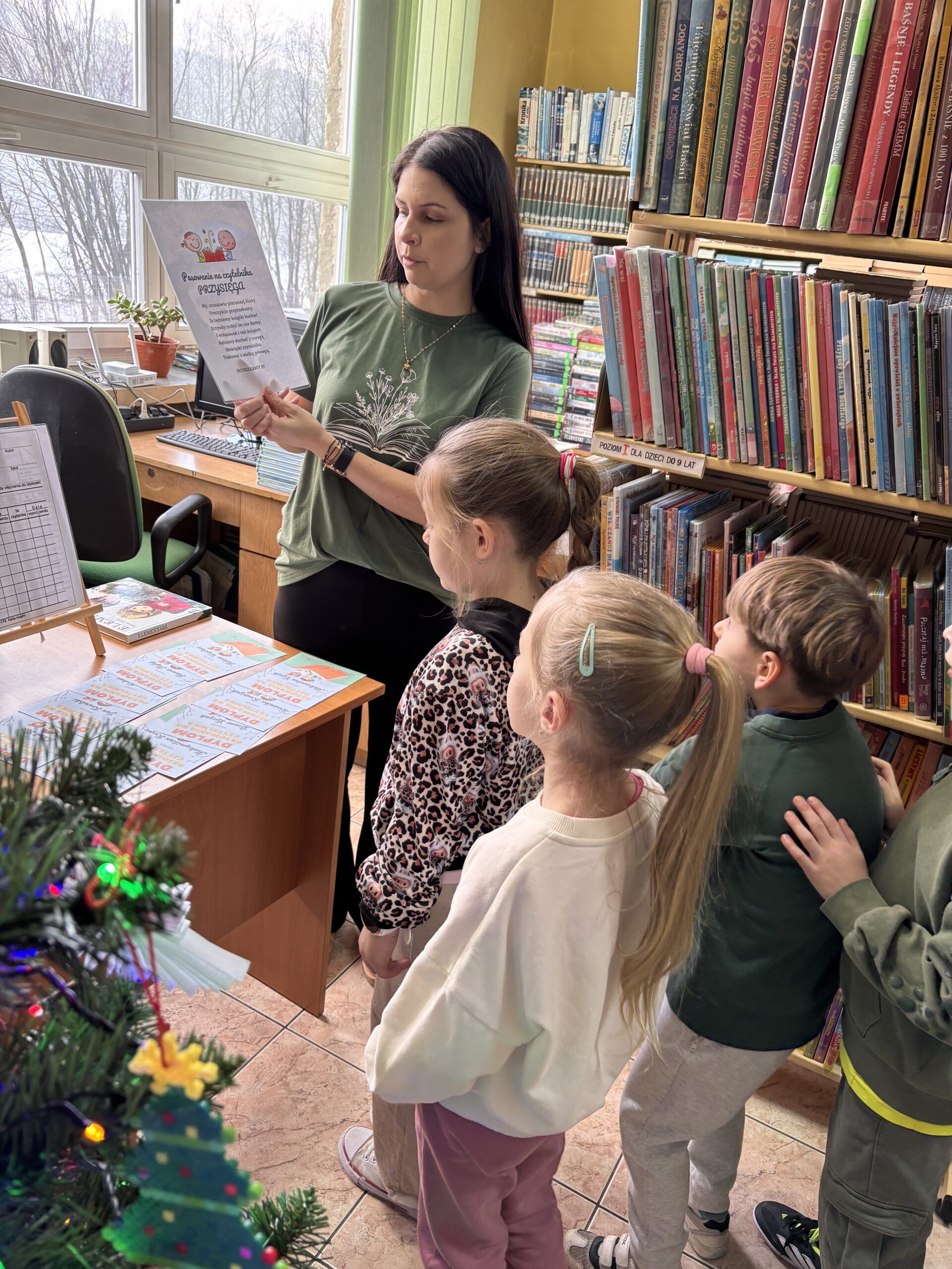 Kolejnym elementem była zabawa ruchowa TAK/NIE, która pomogła utrwalić najważniejsze zasady korzystania z biblioteki, po czym nastąpiło pasowanie na czytelnika – każde dziecko symbolicznie zostało „pasowane” i przyjęte do grona czytelników naszej biblioteki. Następnie każdy uczestnik wypożyczył swoją pierwszą lekturę do domu. Dla pierwszoklasistów zostało również przygotowane wyzwanie czytelnicze, które pomoże im w przyjazny sposób utrwalić nawyk systematycznego wypożyczania i czytania książek.
