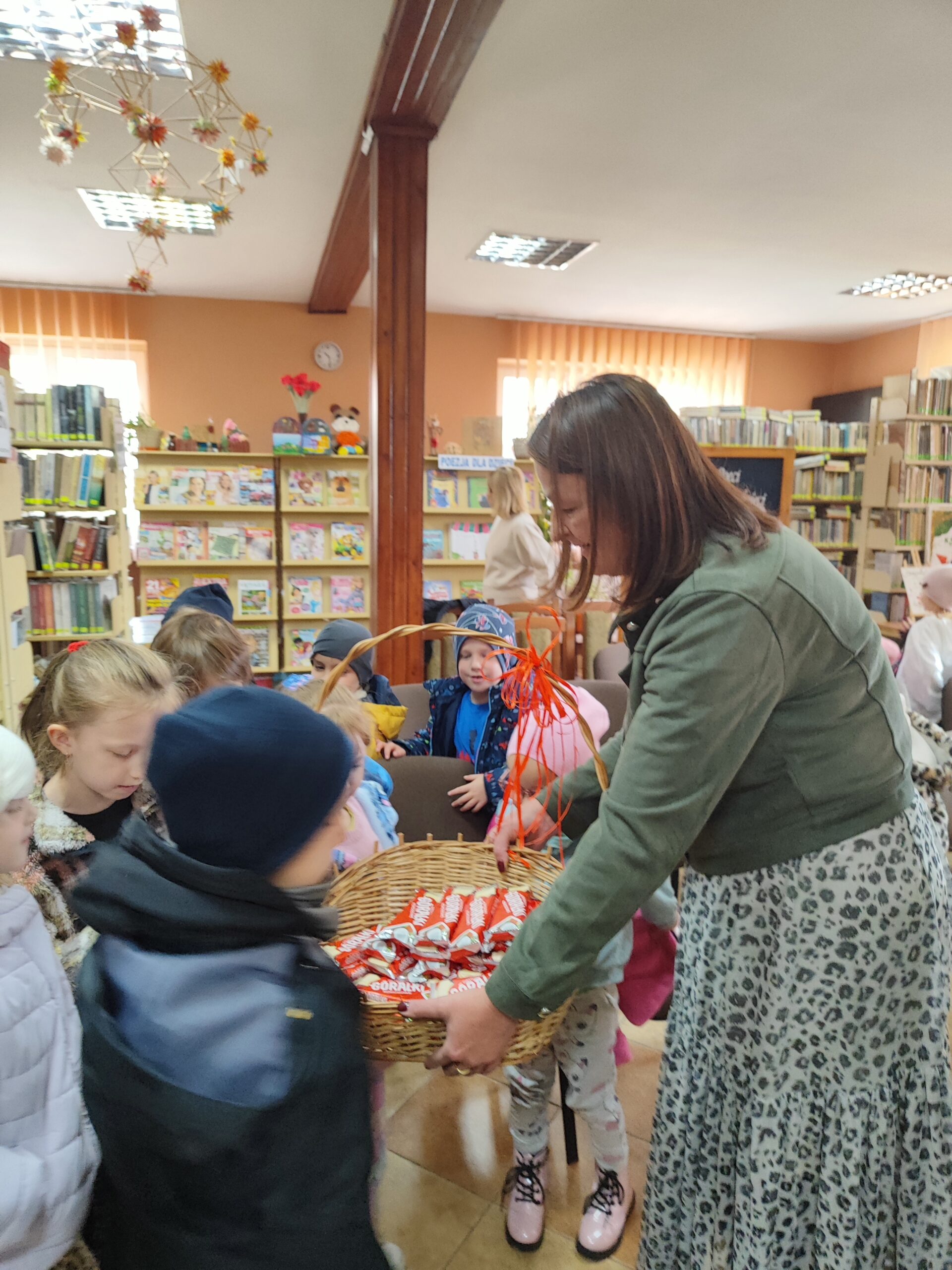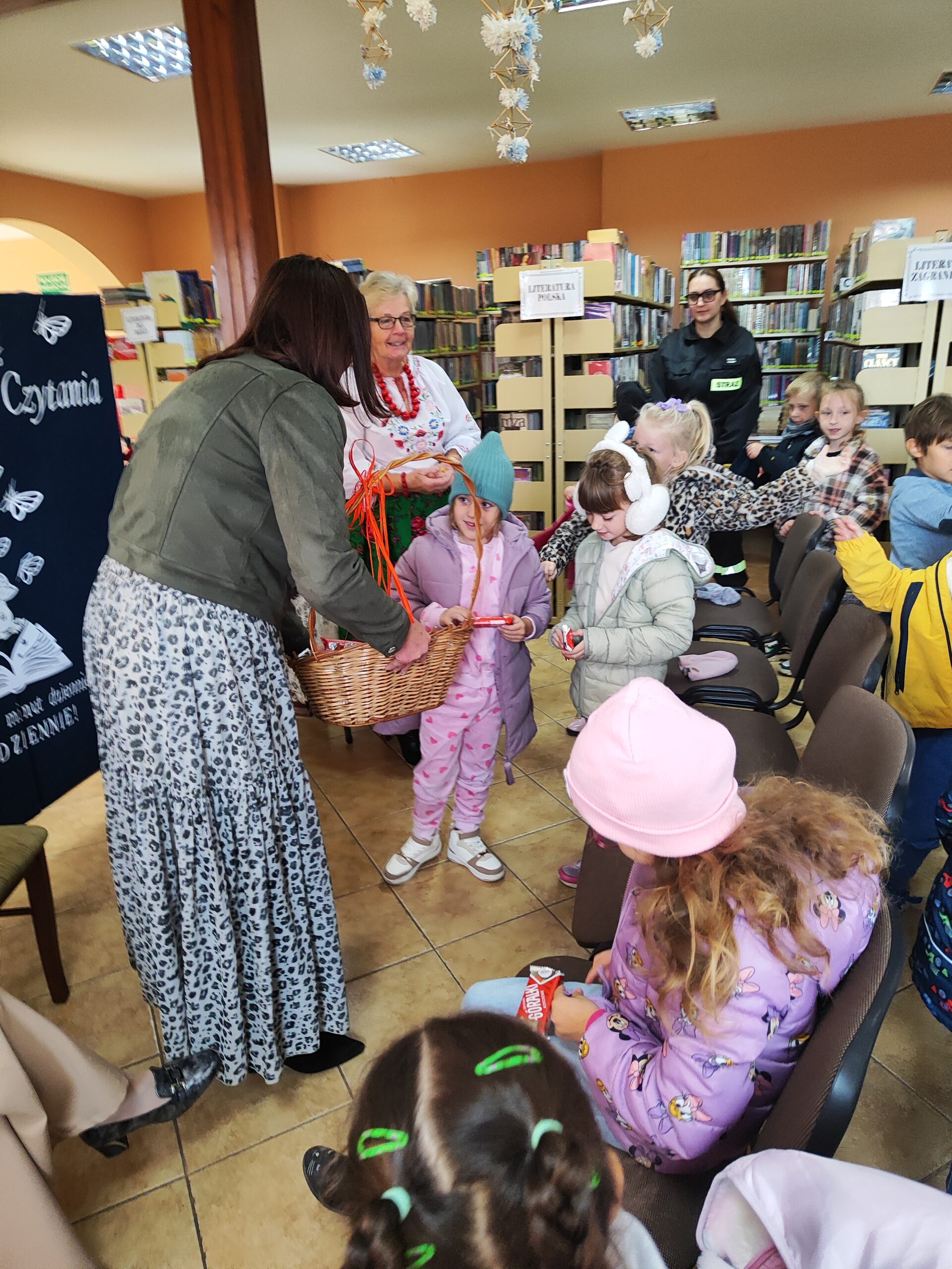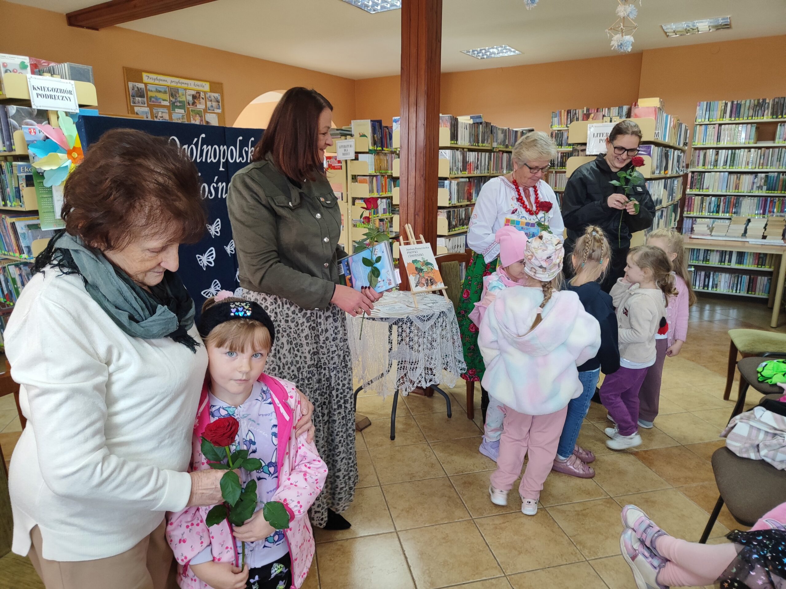 Na koniec akcji czytelniczej w imieniu pani Dyrektor Biblioteki i Ośrodka Animacji Kultury zaproszonym paniom wręczono kwiaty oraz podziękowania  za udział i zaangażowanie w rozwój czytelnictwa, a najmłodsi uczestnicy otrzymali słodki upominek.