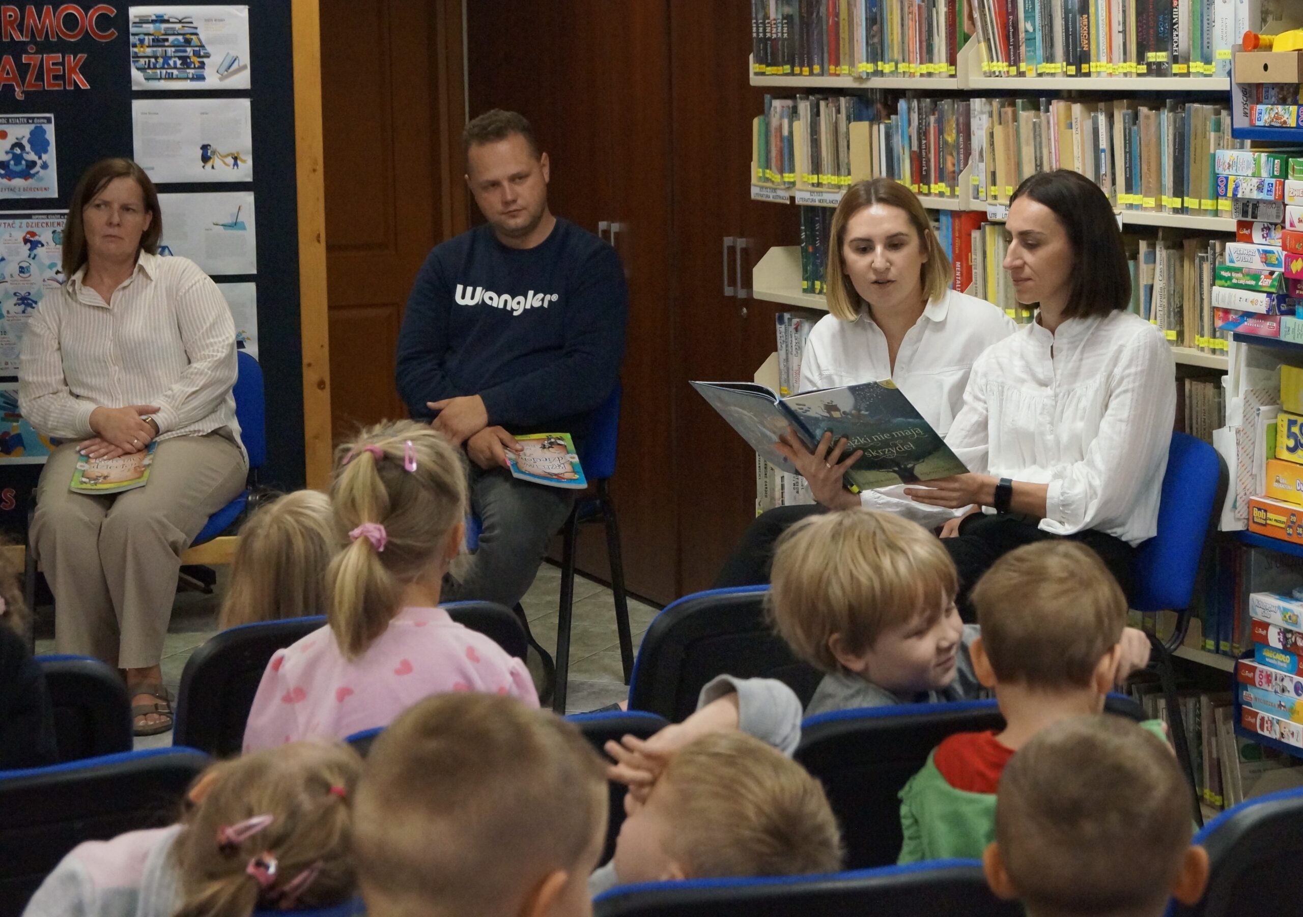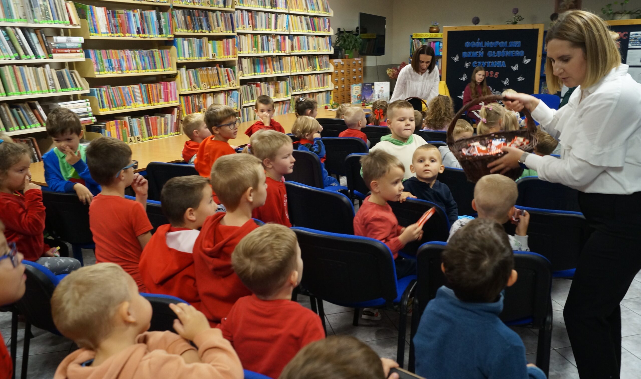 Następnie bibliotekarze Biblioteki Publicznej w Palczy – Anna Gigoń oraz Dorota Mglej- Leśniak wspólnie odczytały książkę pt. „Książki nie mają skrzydeł”.  Ta pięknie ilustrowana książka opowiada o magii czytania i wyobraźni. Czytając tę książkę bibliotekarze podkreślili jak ważne jest by dzieci sięgały po książki. Bowiem książki, które stoją na regałach są po prostu książkami, ale gdy ktoś weźmie je w dłonie i zacznie czytać dzieje się magia. Bo choć książki same nie latają to przenoszą czytelników w niezwykle miejsca.