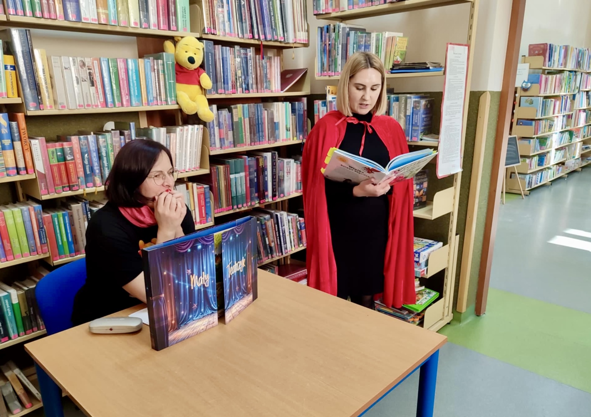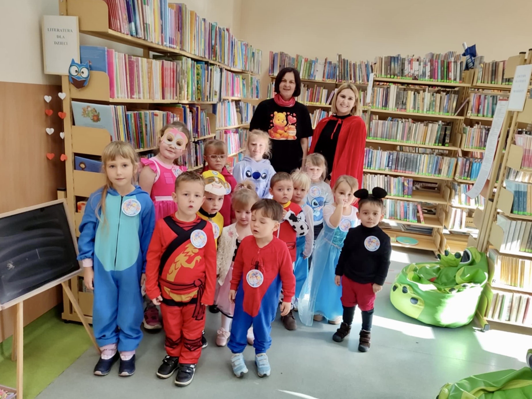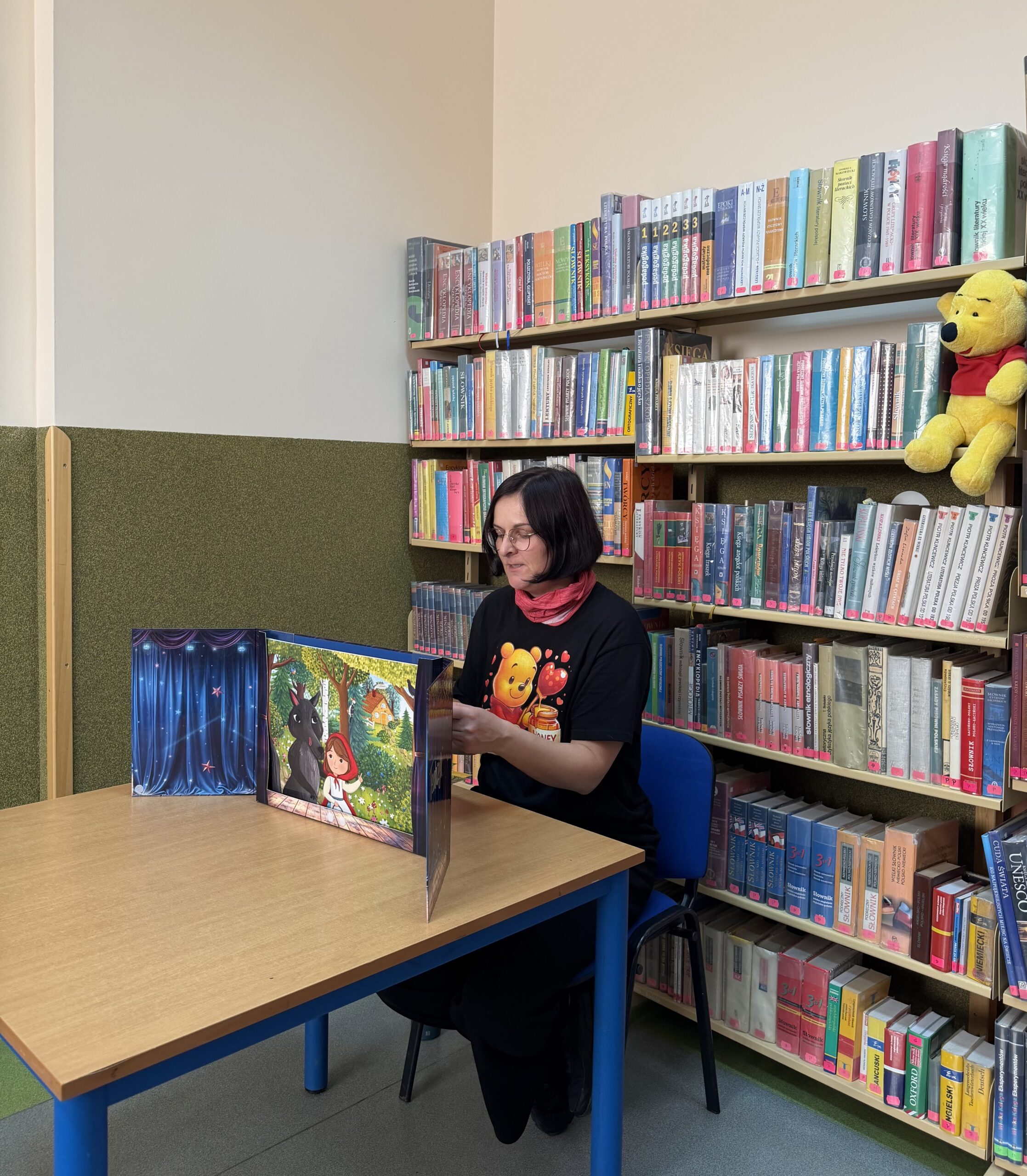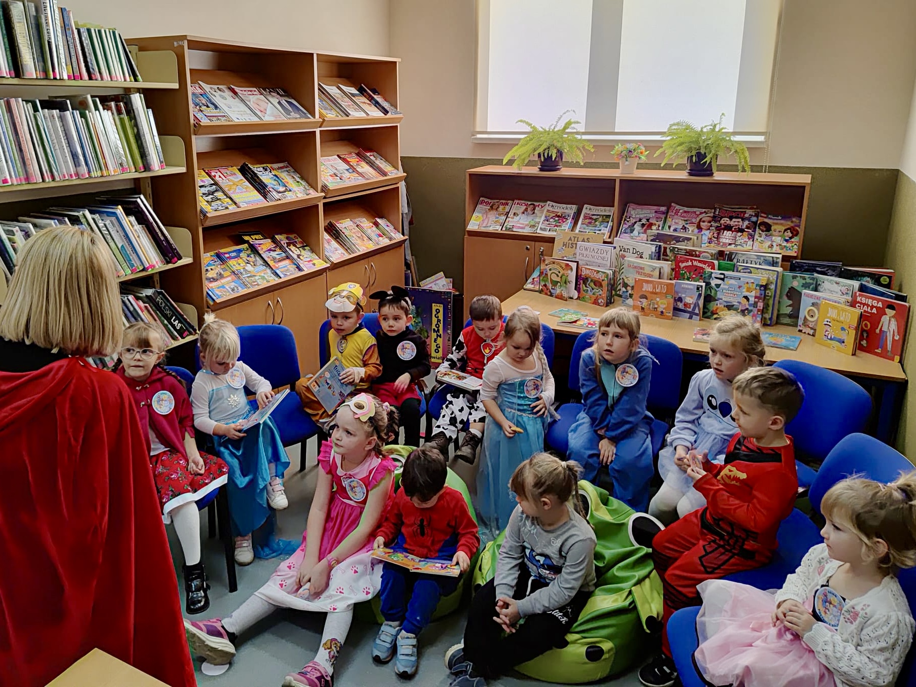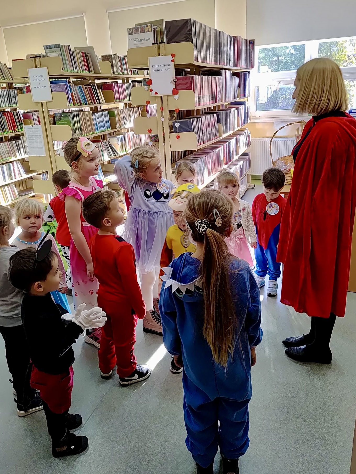 Dzieci zostały serdecznie powitane przez Panią bibliotekarkę z Budzowa, która wcieliła się w rolę przewodniczki po bajkowym świecie. Jednym z punktów spotkania było wspólne czytanie – Pani bibliotekarka z Jachówki zaprezentowała dzieciom klasyczną baśń „Czerwony Kapturek”, która wzbudziła ogromne zainteresowanie słuchaczy. Przedszkolaki chętnie odpowiadały na pytania dotyczące bohaterów i wydarzeń z opowieści.