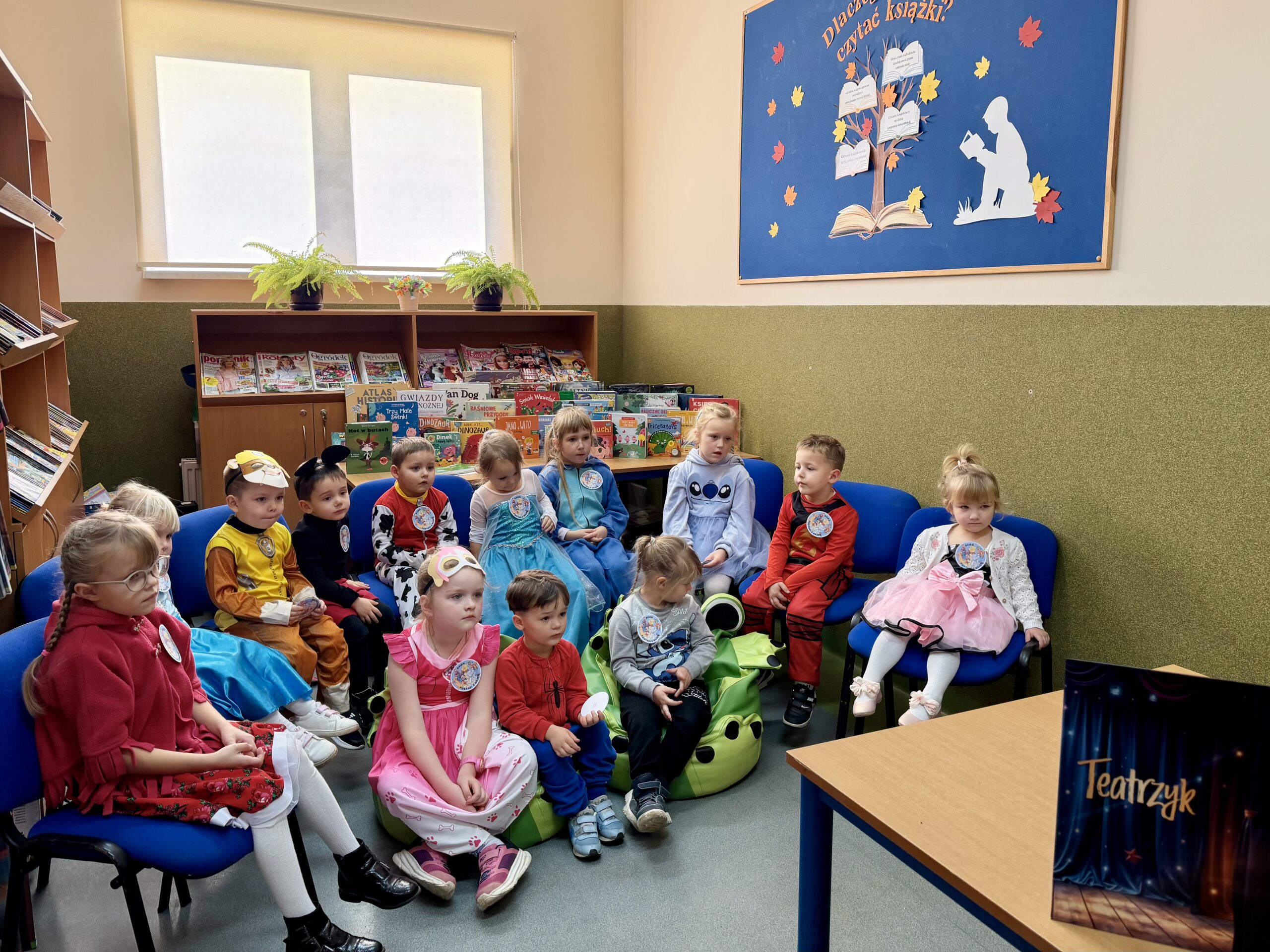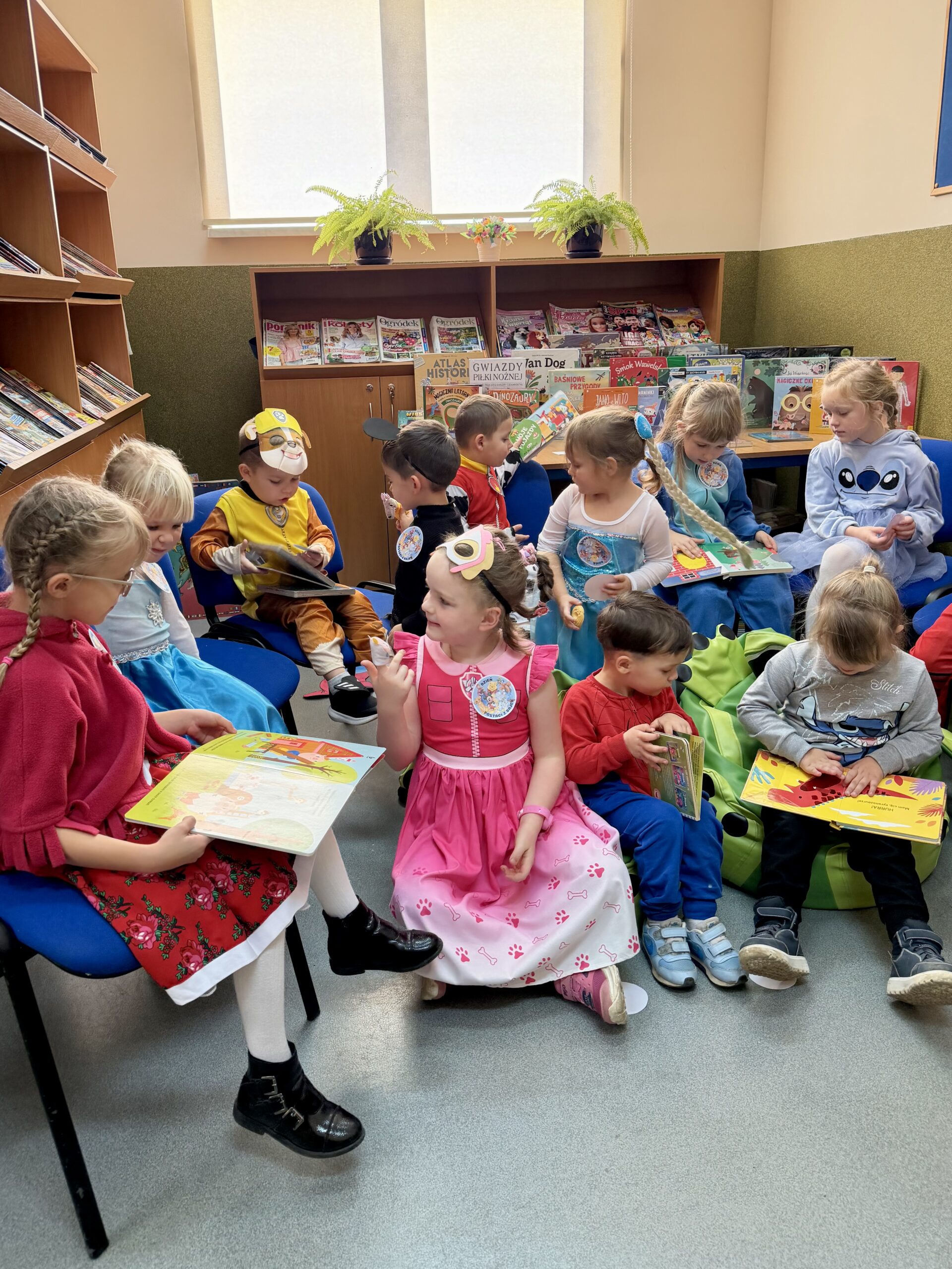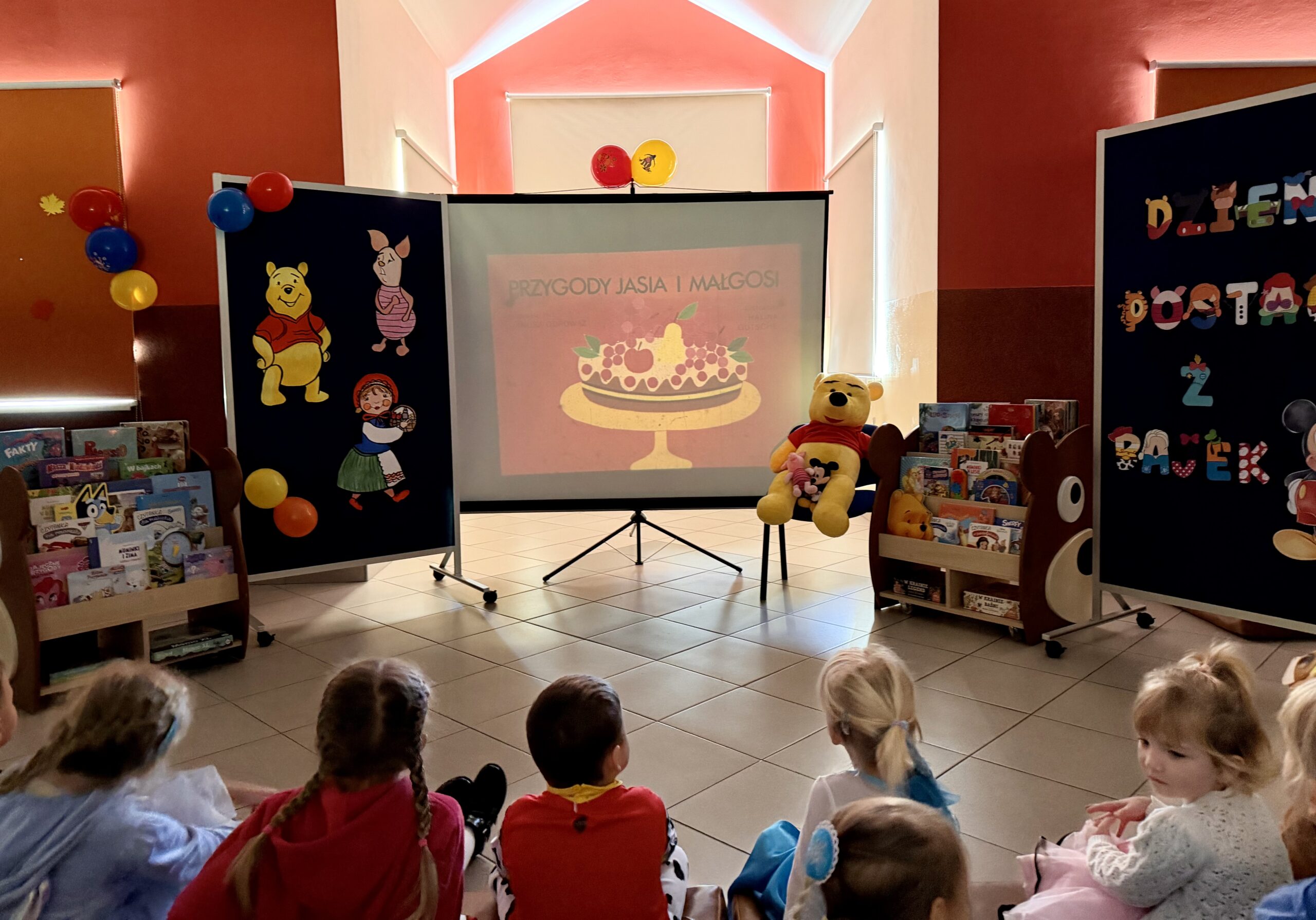 Po przeczytaniu bajki dzieci wzięły udział w krótkiej zabawie tematycznej oraz obejrzały kolorowe książki z działu literatury dziecięcej. Następnie obejrzały bajkę wyświetlaną na projektorze rodem z PRLu, który wzbudził duże zainteresowanie. W bibliotece panowała radosna atmosfera, a najmłodsi z entuzjazmem odkrywali, jak wiele ciekawych historii kryją biblioteczne półki.