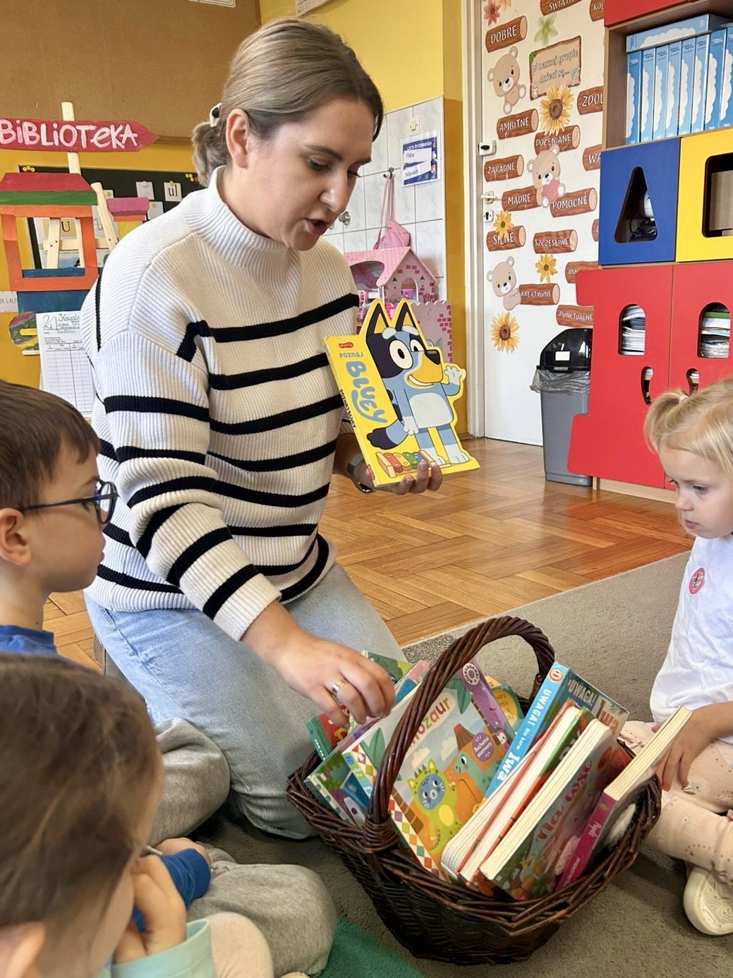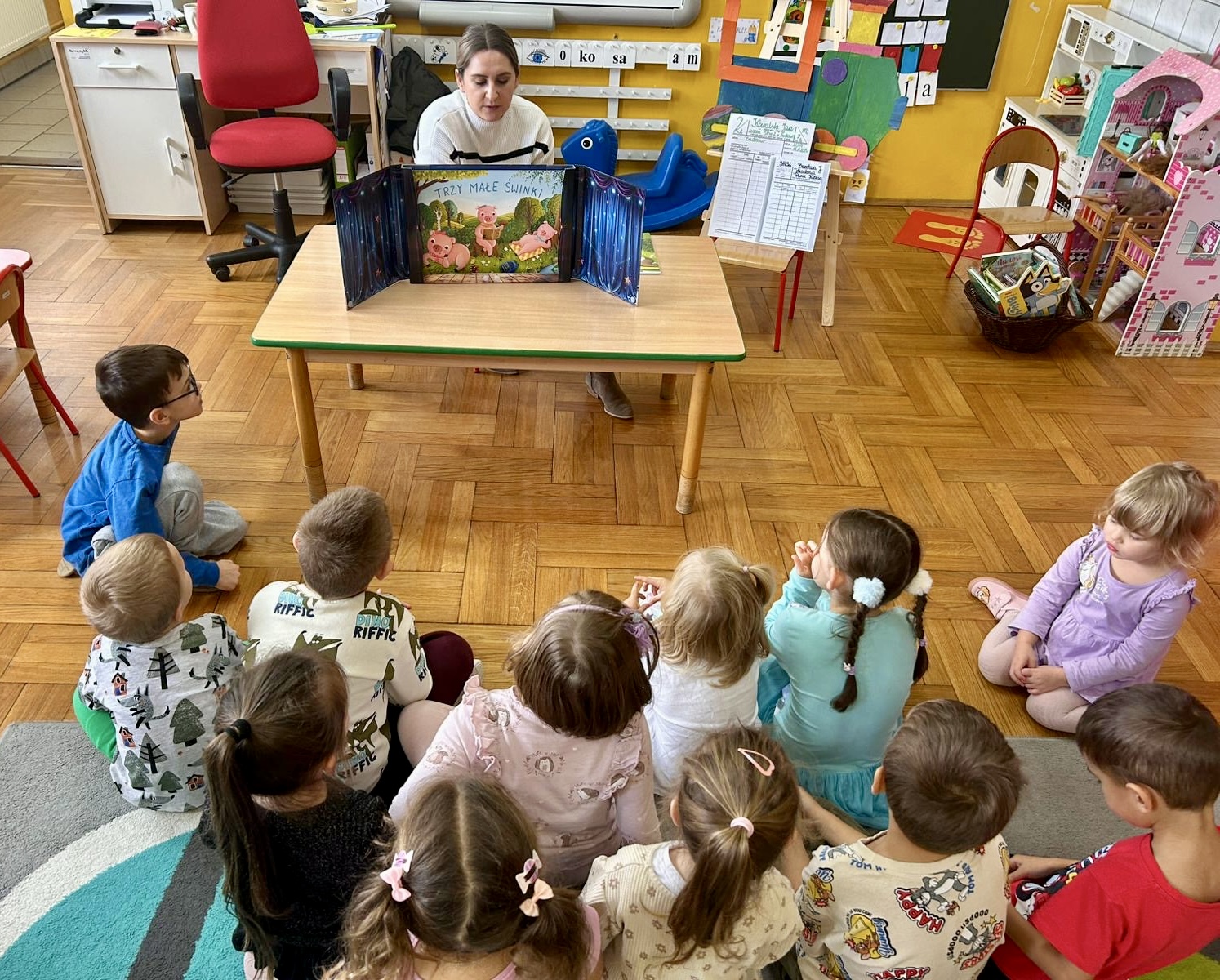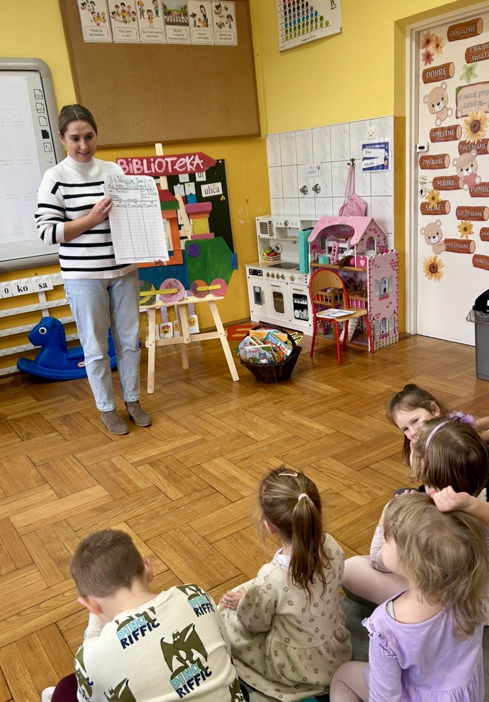 W trakcie wizyty bibliotekarz wytłumaczył w jaki sposób książka trafia z półki do rąk czytelnika, prezentując karty czytelnika i karty książki, a następnie zaprosił do wysłuchania głośnego czytania „Lokomotywy” Juliana Tuwima. Po lekturze przedszkolaki wzięły udział w zabawach literackich – rozwiązywały zagadki dotyczące znanych bajek i baśni, świetnie rozpoznając ulubionych bohaterów. Następnie dzieci wysłuchały klasycznej baśni „Trzy Małe Świnki”przedstawionej w formie aktywizującego teatrzyku. Przedszkolaki wcieliły się w rolę wilka i wspólnymi siłami próbowały zdmuchnąć domki świnek, co sprawiło im wiele radości i wciągnęło je w świat baśni. W trakcie spotkanie dzieci wspólnie oglądały książki, poznając różne ilustracje, autorów i formaty książek, rozmawiając o tym, dlaczego warto je czytać.