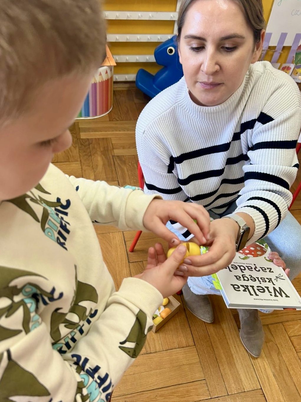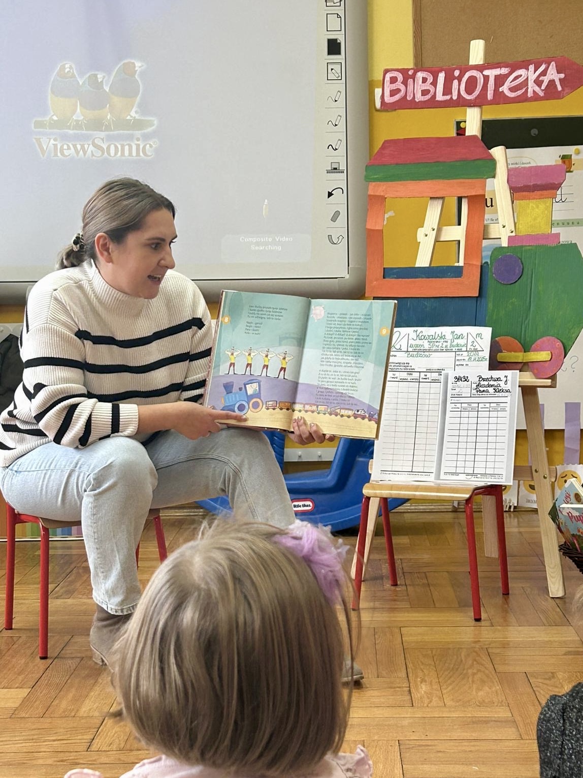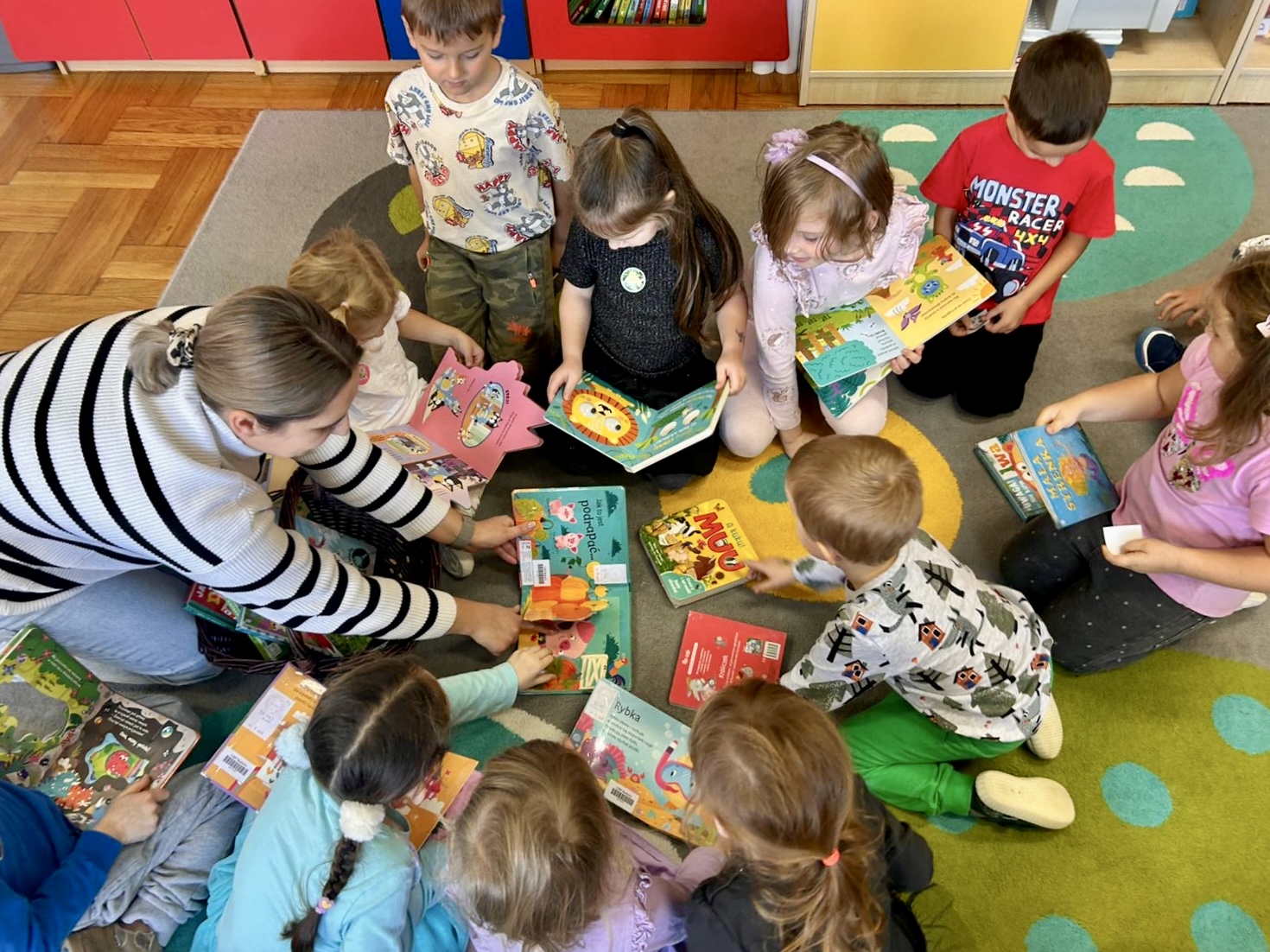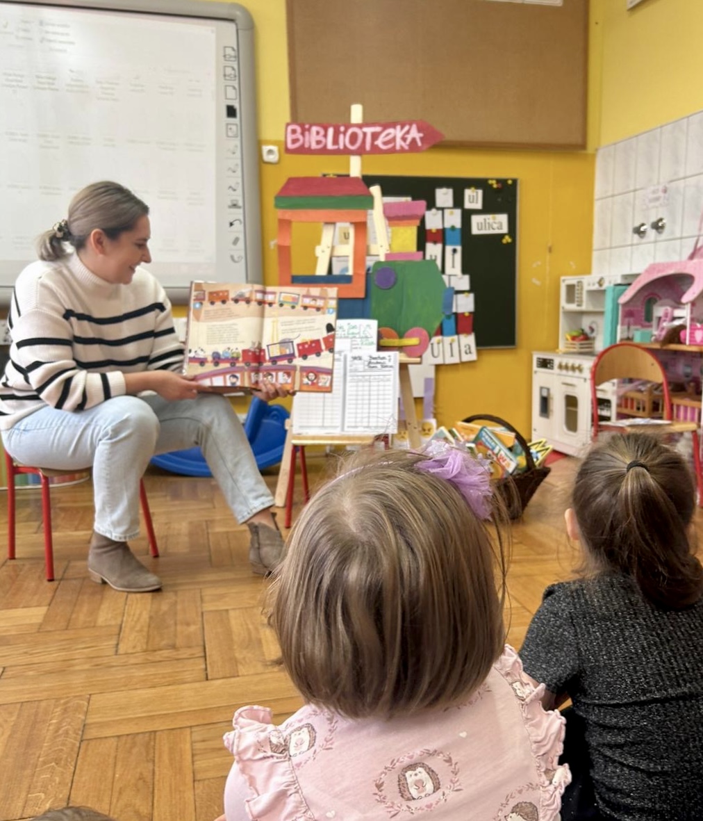 W trakcie wizyty bibliotekarz wytłumaczył w jaki sposób książka trafia z półki do rąk czytelnika, prezentując karty czytelnika i karty książki, a następnie zaprosił do wysłuchania głośnego czytania „Lokomotywy” Juliana Tuwima. Po lekturze przedszkolaki wzięły udział w zabawach literackich – rozwiązywały zagadki dotyczące znanych bajek i baśni, świetnie rozpoznając ulubionych bohaterów. Następnie dzieci wysłuchały klasycznej baśni „Trzy Małe Świnki”przedstawionej w formie aktywizującego teatrzyku. Przedszkolaki wcieliły się w rolę wilka i wspólnymi siłami próbowały zdmuchnąć domki świnek, co sprawiło im wiele radości i wciągnęło je w świat baśni. W trakcie spotkanie dzieci wspólnie oglądały książki, poznając różne ilustracje, autorów i formaty książek, rozmawiając o tym, dlaczego warto je czytać.